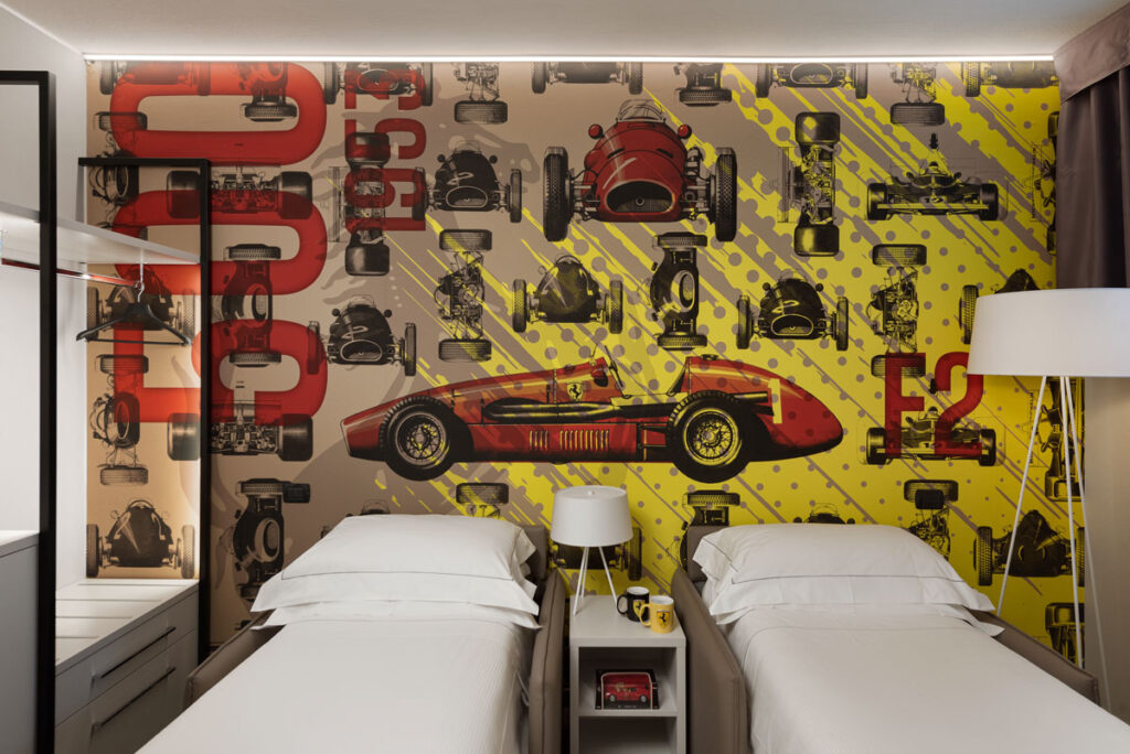 Le camere Quadruple Deluxe presentano un arredamento contemporaneo e sono declinate nei colori classici della Ferrari: rosso e giallo con grafiche di Alboreto, Marzotto e Regazzoni.